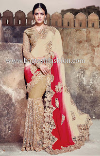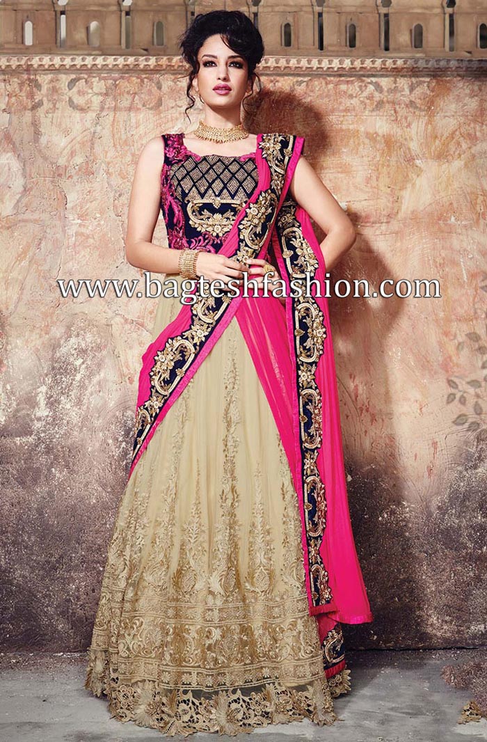 Amazing beige and pink net gown cum saree designed with resham, zari, stone, sequins and patch border work.